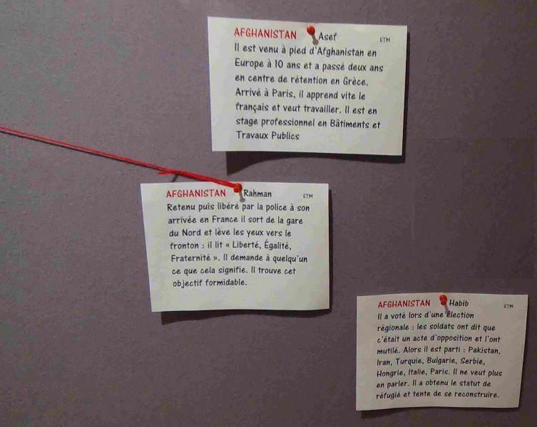 Avaient été présentés des travaux de stagiaires sur ce thème : dessins sur leur première impression lors de leur arrivée en France, oeuvres d'Arts Plastiques sur leur parcours jusqu'à Paris.